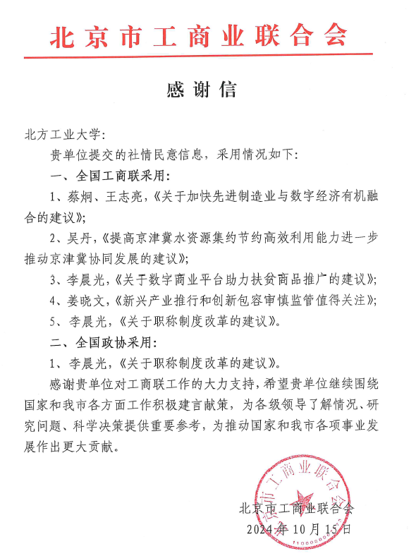 2024年10月16日,北京市工商业联合会发来感谢信,对公司bw西汉姆联投稿的“社情民意信息”被全国政协和全国工商联采用的情况进行通报并表示感谢。