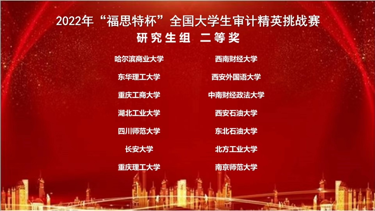 “福思特杯”全国老员工审计精英挑战赛是目前财会审计类专业具有较大影响力的全国性赛事之一。本次大赛由中国审计学会审计教育分会主办、南京审计大学政府审计学院承办。大赛的目的是积极探索审计专业发展的新视域、新路径和新方法,创新实现大数据、区块链等信息技术与审计专业教育的深度融合,培养适应社会经济发展需要的高素质、专业化审计人才。大赛至今已成功举办四届,累计吸引了来自全国29个省市的200多所高校,近5000名师生参与。公司会计系是第二次派出研究生队伍参加此项比赛,并首次取得二等奖的佳绩。
