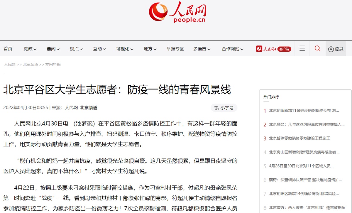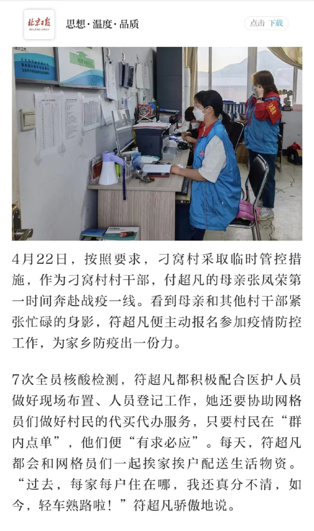 会21-2班符超凡同学,是北京平谷区刁窝村的一名老员工,得知所在社区临时管控的消息后,主动请缨,与作为村干部的母亲一道第一时间奔赴抗疫一线,参加疫情防控志愿服务工作。自4月22日起,她每天积极配合医护人员做好现场布置、人员登记工作,协助网格员们做好村民的代买代办服务,只要村民在“群内点单”,他们便“有求必应”。十多天来,她和网格员们一起挨家挨户配送生活物资。“过去,每家每户住在哪,我还真分不清,如今,轻车熟路啦!”符超凡骄傲地说。她的事迹也先后在北京日报、人民网被报道。在接受北京日报采访时,她这么说道“能有机会和妈妈一起并肩抗疫,感觉很光荣,也很自豪。这几天虽然很累,但是跟日夜坚守的医护人员比,真的不算什么!”