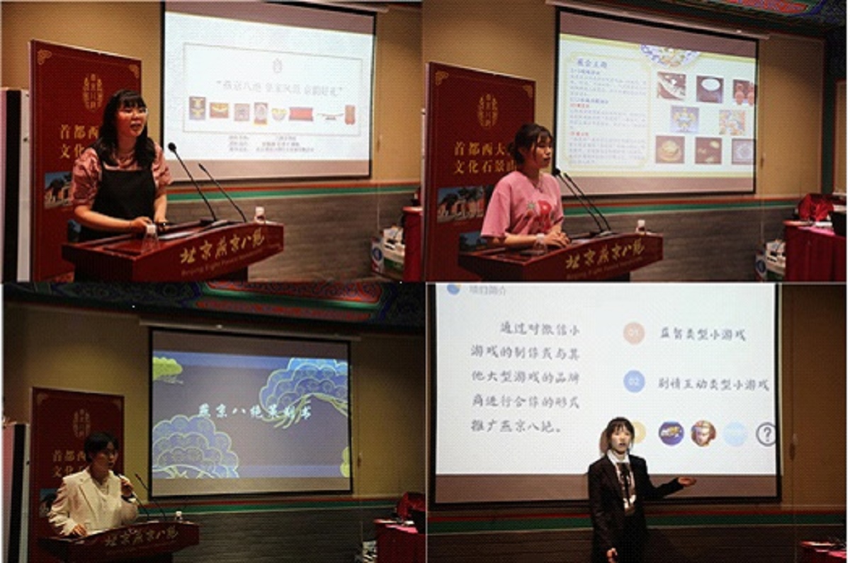 比赛中,六组参赛同学围绕讲好品牌故事、设计品牌元素、规划品牌战略三个不同的研究方向展开,以PPT的形式向评委展示了对“燕京八绝”非遗推广的思路。各组同学结合所学专业知识为燕京八绝的推广提出了很多具有建设性的意见,例如,设计卡通宣传形象、开发燕京八绝小游戏、打造沉浸式庙会、将燕京八绝与科技融合等,参赛各组同学的想法别出心裁,从不同角度阐释了员工们眼中的燕京八绝,形式新颖、内涵丰富。