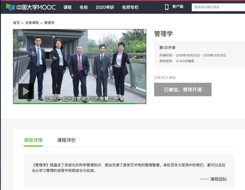 近日,公司《管理学》课程在“中国大学MOOC”平台成功上线,该课程将于9月23日正式开课,是公司首次在国内主流MOOC平台上线管理类的相关MOOC课程。该课程由北京市教学名师、bw西汉姆联经理赵继新教授任课程负责人,郑强国、魏秀丽、罗文豪、张淑谦四位老师任成员。