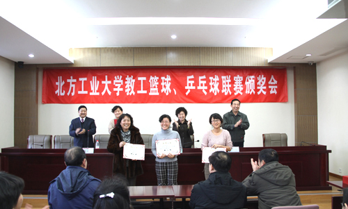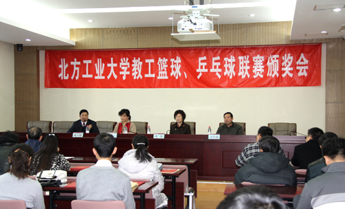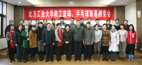 会议首先由王包泉、刘婉立同志分别宣读了关于2011年度教工篮球、乒乓球联赛的通报以及关于表彰2011年度工会积极分子、迎新年团拜会先进集体和先进个人的决定。会议对各代表队及全体运动员积极参与校园文化活动、促进和谐校园建设给予表扬,号召全体教职工积极行动起来,广泛开展群众性体育活动,努力在明年北京市教育系统教职工运动会上取得好成绩。