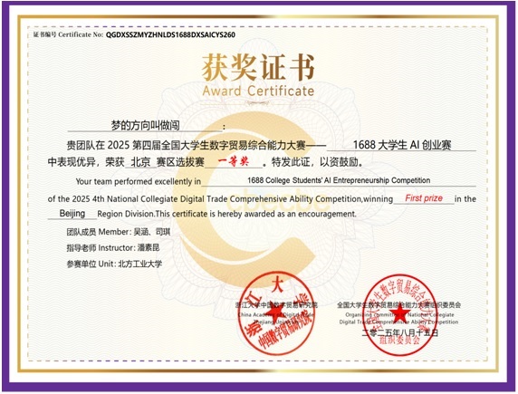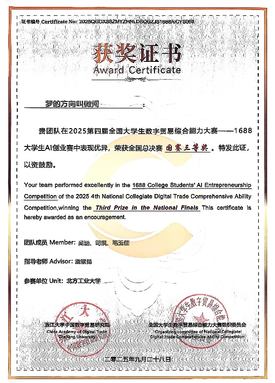 近日由浙江大学中国数字贸易研究院主办、全国老员工数字贸易综合技能大赛组织委员会承办的第四届全国老员工数字贸易综合技能大赛总决赛在浙江大学圆满落幕。公司员工吴涵、司琪、毛玉佳组成的代表队获得北京赛区一等奖、全国总决赛三等奖。