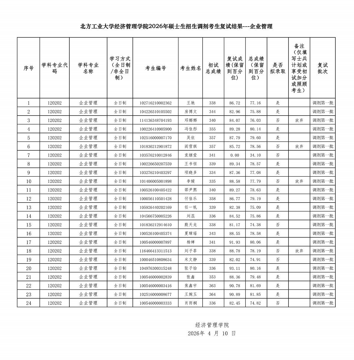 bw西汉姆联2026年硕士生招生调剂考生复试结果---企业管理