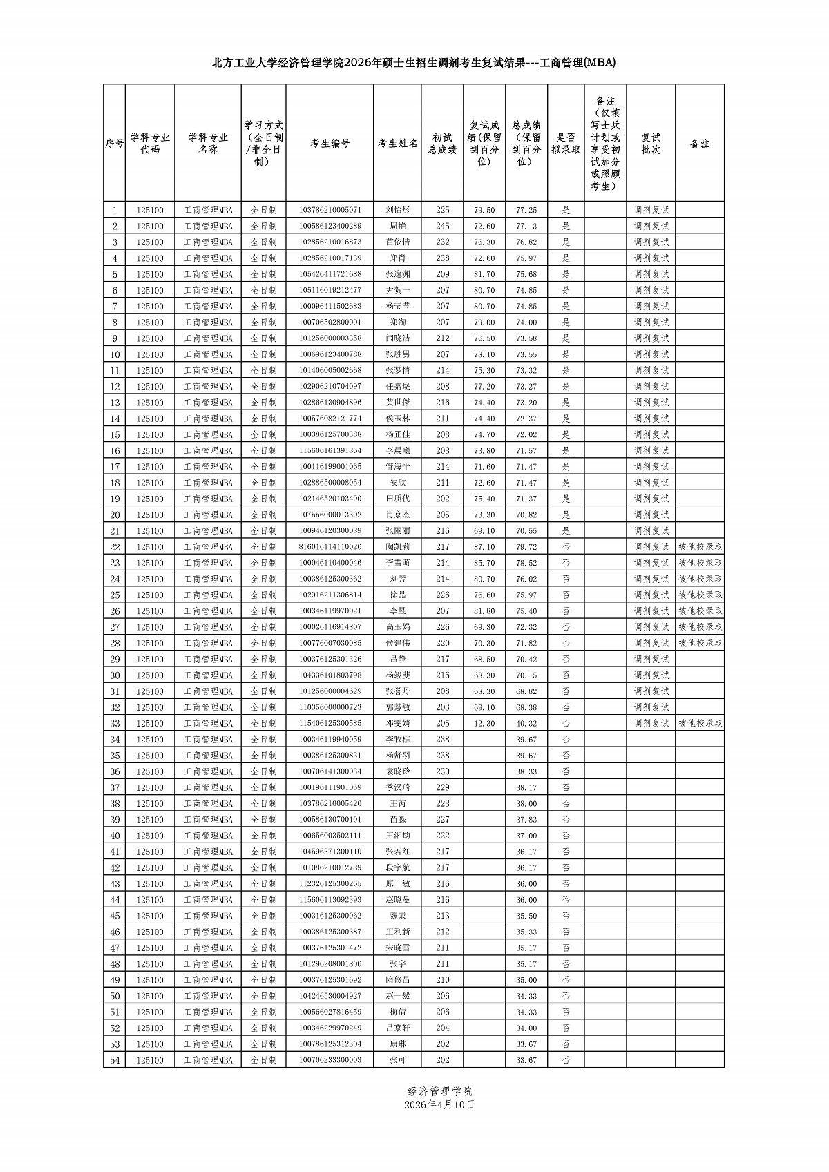 bw西汉姆联2026年硕士生招生调剂考生复试结果---工商管理(MBA)