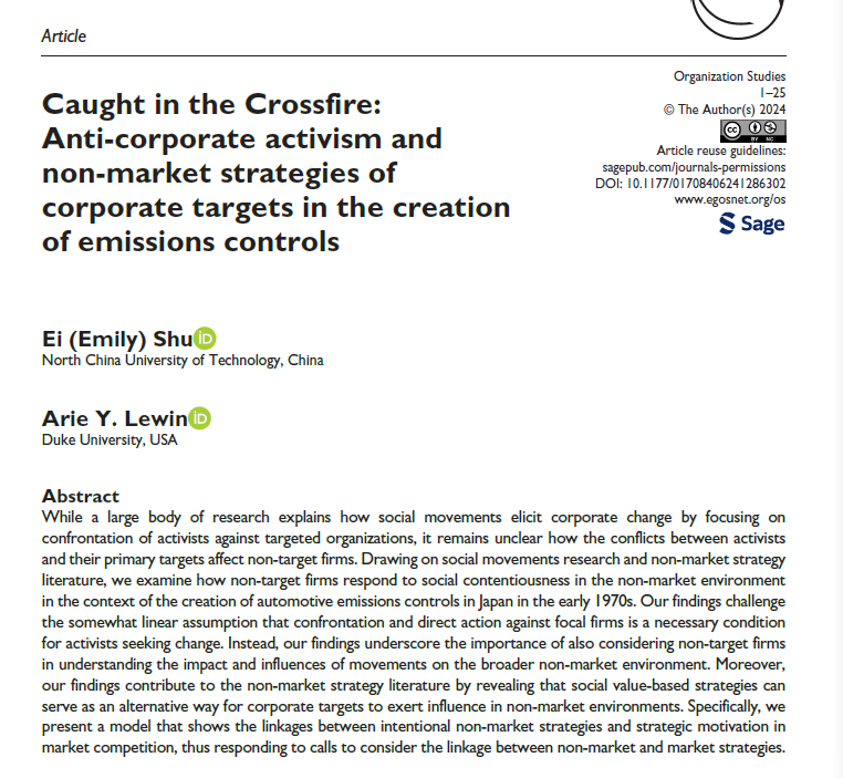 bw西汉姆联朱瑛教授以第一作者身份在工商管理领域顶级国际期刊,FMS 管理科学国际 A 级期刊《OrganizationStudies》上发表题为《Caught in the Crossfire: Anti-Corporate Activism and Non-Market Strategies of Corporate Targets in the Creation of Emissions Controls》的学术论文。该论文运用定性数据分析法(qualitative data analysis),分析了日本环境保护団体与汽车行业巨头公司的对峙中,资源弱小的非目标企业(non-target firms)如何利用非市场战略(non-market strategy),使竞争对手陷入困境,从而取得竞争优势。文章提出两个重要的理论观点:即建立社会价值(social-value based) 为主的非市场战略的有效性及市场战略与非市场战略的关联性。从而扩展了以往以CSR与CPA为主体的非市场战略理论,具有重要的理论贡献。此外,本文论证了企业在应对环境与节能等非市场性的社会问题时,通过与社会相关利益团体的互动,提高国际市场竞争力的可行性,对现代企业应对外界环境的多元化,具有战略性实践意义。该论文的合作者是美国杜克大学福库商学院Arie Lewin教授。