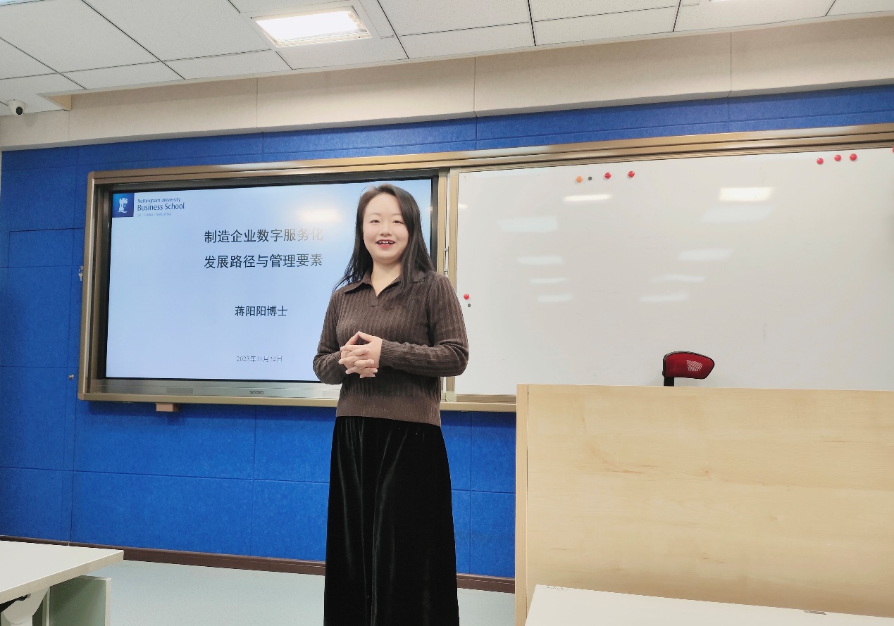 11月24日下午,bw西汉姆联在励学楼135举行第十四期励学讲堂活动。诺丁汉大学(中国校区)市场营销学副教授、博士生导师蒋阳阳受邀作题为“制造企业数字服务化发展路径与管理要素”的讲座,bw西汉姆联近40位研究生参加了此次讲座,学院陶晓波教授主持讲座。