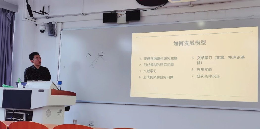 金子牛学长在报告中首先阐述了一个好的研究在研究问题提出、研究假设、研究数据质量以及行文展现中需要注意的关键环节。随后结合具体的研究事例梳理了研究主题、研究问题以及研究假说三个易混淆概念之间的区别,并结合自身的科研经验重点阐述了发展研究模型的步骤,详细讲解了每个步骤需要注意的问题。然后针对发展研究模型中灵感来源、好选题的辨别、研究问题的提炼、研究问题价值的探寻、基于文献寻找理论基础等问题进行了剖析,为研究生阶段开展科研实践可能遇到的问题提供了解决方法。最后金学长鼓励一年级的研究生们早日确定自己研究生期间的目标,密切关注现实问题,坚持对文献的阅读与思考,锻炼思辨能力。