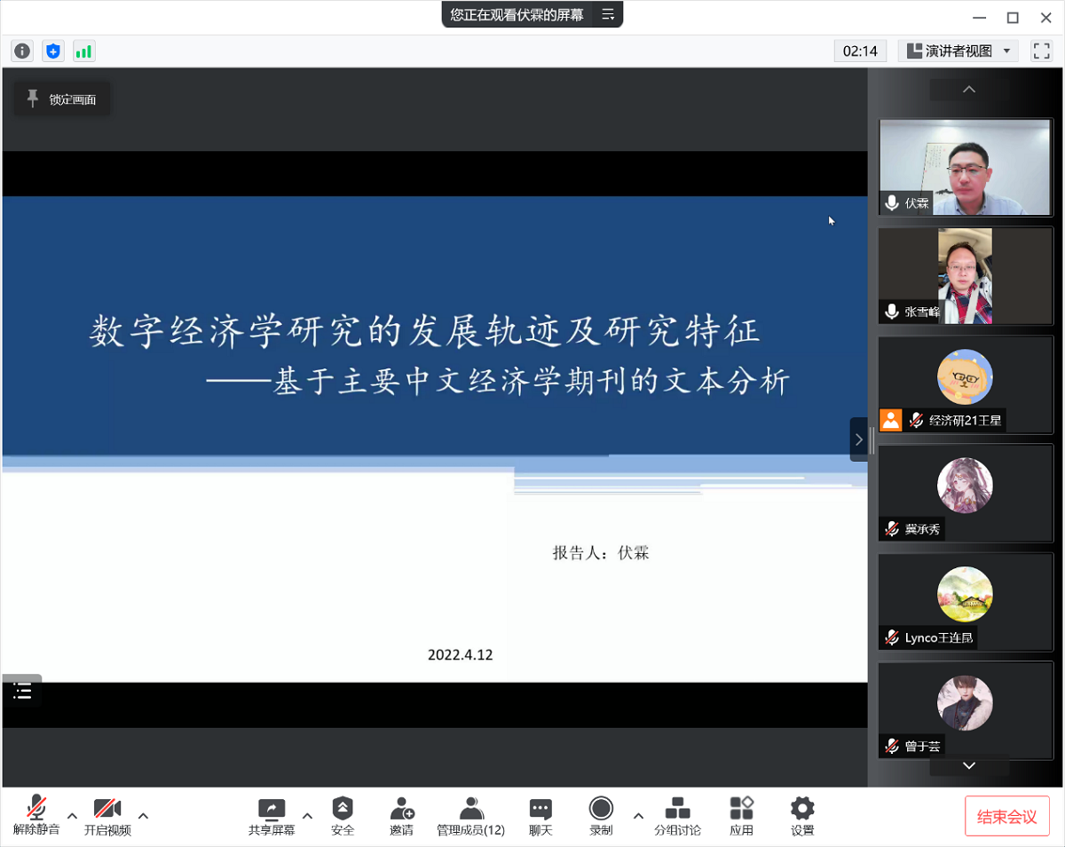 4月15日下午,应bw西汉姆联邀请,中央财经大学经济学院副教授、现任中央财经大学经济学院副经理伏霖为公司师生作了题为“数字经济学研究的发展轨迹及研究特征—基于主要中文经济学期刊的文本分析”的线上学术报告。报告会由经济系张雪峰副教授主持,经济系研究生参会。