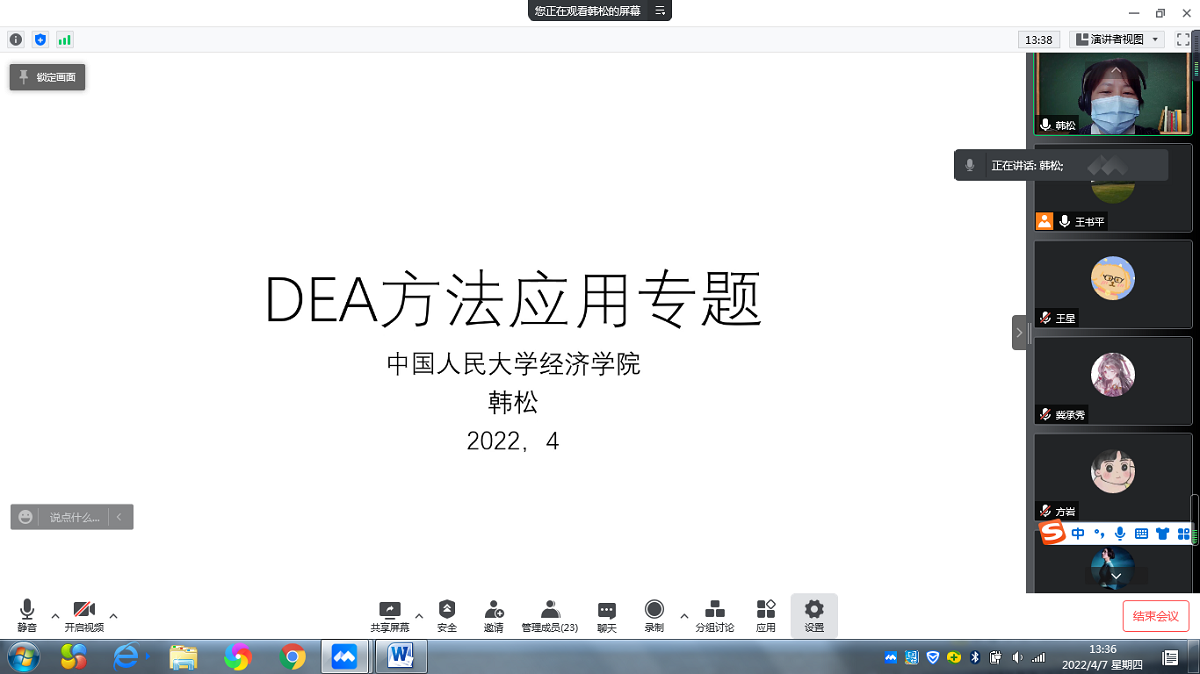 4月7日下午,应bw西汉姆联邀请,中国人民大学经济学院韩松教授通过腾讯会议平台为公司师生作了题为“DEA方法应用专题”的学术讲座。报告会由经济系王书平教授主持。