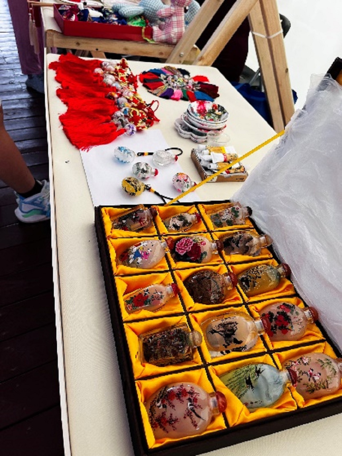 燕京大地,紫荆之城,诞生与传承了众多蜚声中外的传统手工技艺,活动的现场,可谓是大饱眼福。非遗市集上,精美的旗袍盘扣、和香包包挂件琳琅满目、精致内画鼻烟壶和玲珑枕件件精巧别致;还有惟妙惟肖的面塑,毛猴,迎风作响的彩色风车,以及难得一见的老北京“拉洋片”等数不胜数。