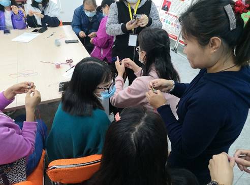 活动上主持人先对社区居民及我支部师生的到来表示热烈欢迎。接着,主持人借助大屏幕向大家讲解了蛇结、金刚结的起源及特殊寓意,并与大家展开了丰富的互动。随后是本次活动最重要的环节——编制彩绳。大家纷纷拿起材料开始学习编制彩绳。主持人向大家详细地演示编制步骤,大家对此兴趣高涨,跃跃欲试。彩绳在大家手中飞舞,左缠右绕。