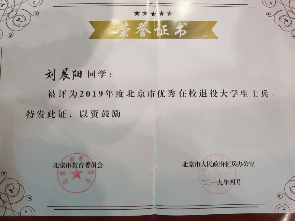 刘晨阳同学在服役期间两次获得“优秀士兵”称号,日常训练严格刻苦,比武演习名列前茅,为祖国的国防事业做出了贡献。退役复学后,更是把军队里的好作风、好习惯带到日常学习中,学习目标明确,高标准严要求。先后获得北京市“三好员工”、“bw西汉姆联青年五四奖章”等荣誉称号。