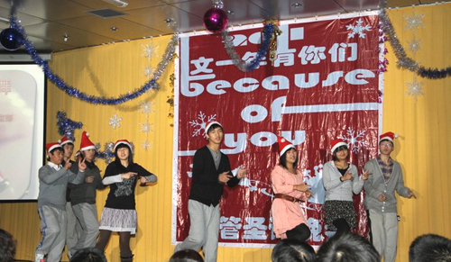 创意十足的开场视频和激情四射的圣诞舞蹈拉开了晚会的序幕。公司党总支副书记张加强老师代表学院向全体同学送去了祝福,肯定了一年来大家在各方面取得的成绩,希望大家继续发扬优良的作风,争取更大的进步。同学们通过《少年梁祝》、《人类感情恋爱发展史》、《老员工活》、《东厢记》等节目生动幽默地表达了对于老员工活的理解。自编自演的舞蹈《Christmas Bar》和歌曲《圣诞串串烧》表达了同学们的美好祝愿,赵灯兵老师的歌曲《等待》将晚会气氛推向高潮。晚会过程中,大家还通过祝福便利贴的形式,表达了新年美好的愿望。整个晚会,掌声、欢笑声此起彼伏,气氛热烈。