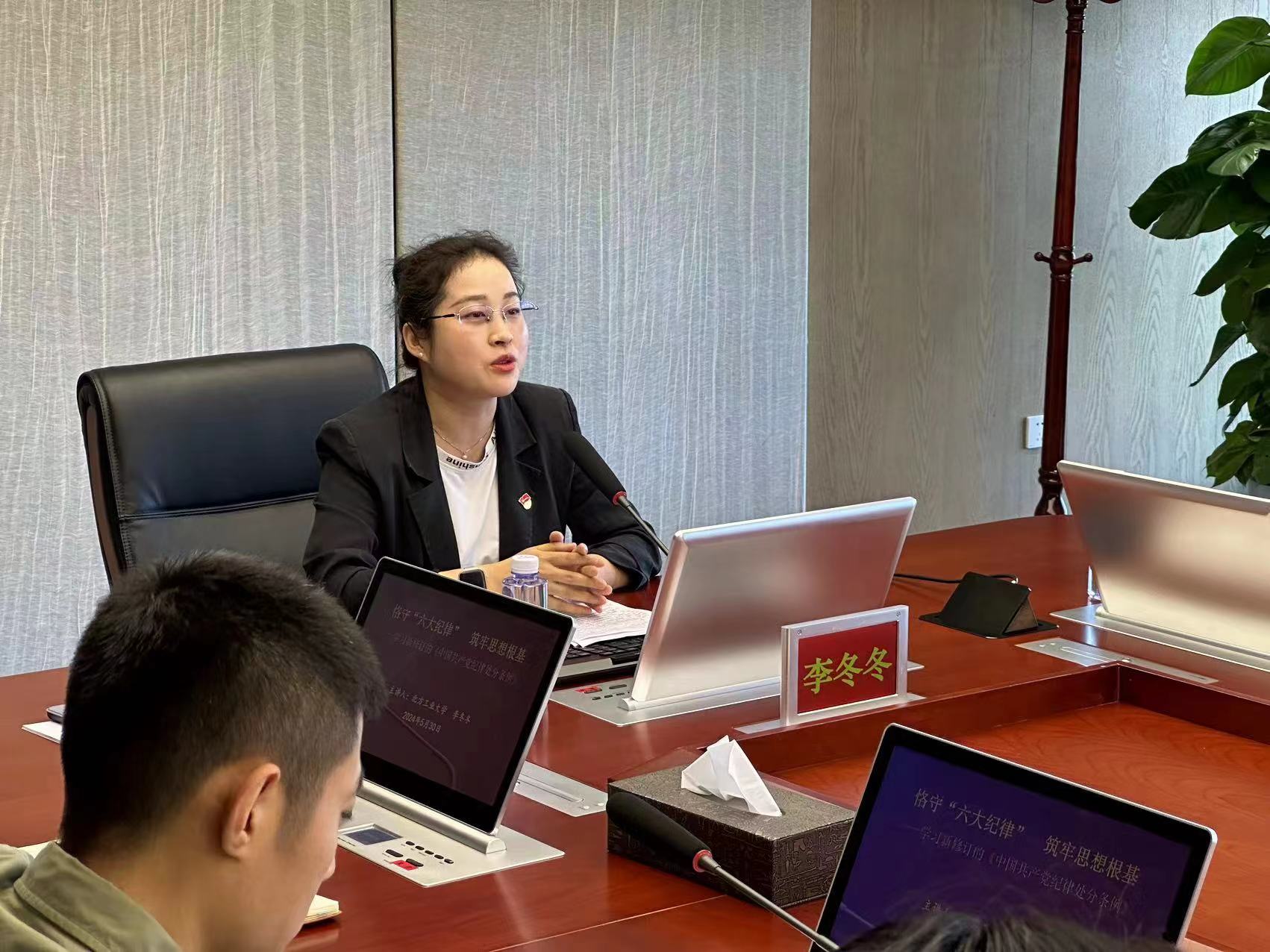 会上邀请马克思学院李冬冬老师结合关于党的纪律建设系列重要讲话重要指示精神,以党的“六大纪律”为重点,系统讲解新修订的《中国共产党纪律处分条例》(以下简称《条例》),倡导党员同志牢固树立党章党规党纪意识,自觉在廉洁自律上追求高标准,在严守党纪上远离红线,做到守纪律、讲规矩,知敬畏、存戒惧,充分发挥党员先锋模范作用。