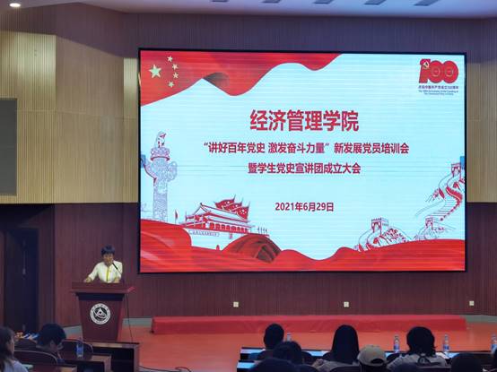 之后,王伟宾书记为员工党史宣讲团成员颁发聘书,并结合习近平总书记在庆祝中国共产党成立100周年“七一勋章”颁授仪式上的重要讲话,为新发展党员做了培训。他强调,站在“两个一百年”奋斗目标的历史交汇点上,同时面对当今世界百年未有之大变局,党史学习教育意义重大,建党百年,是我们学习的新起点,我们要继续不断学习实践中国共产党人坚定信念、践行宗旨、拼搏奉献、廉洁奉公的高尚品质和崇高精神,武装自己,在实践中更好的发挥党员的先进性。新入党的同学要认真学习党史、新中国发展史、改革开放史和社会主义发展史,继续深入了解我们党领导人民进行艰苦卓绝的奋斗历程,从灵魂深处涵养爱党爱国的深厚情怀,真正做到立得住信念、守得住初心使命、经得住风浪考验。