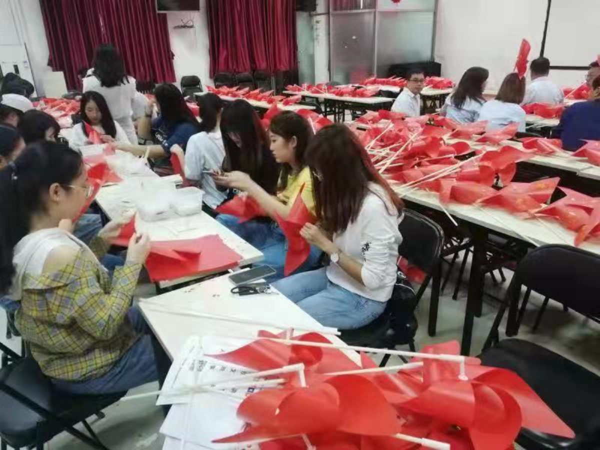 座谈会后,员工党员与社区党员、中小员工和一起动手为社区进行迎国庆环境布置。大家制作了带有国旗图案的风车,并前往社区空地,将风车摆放成“庆70”的字样,安插在草坪当中,为社区里增添了迎国庆的喜悦气氛。